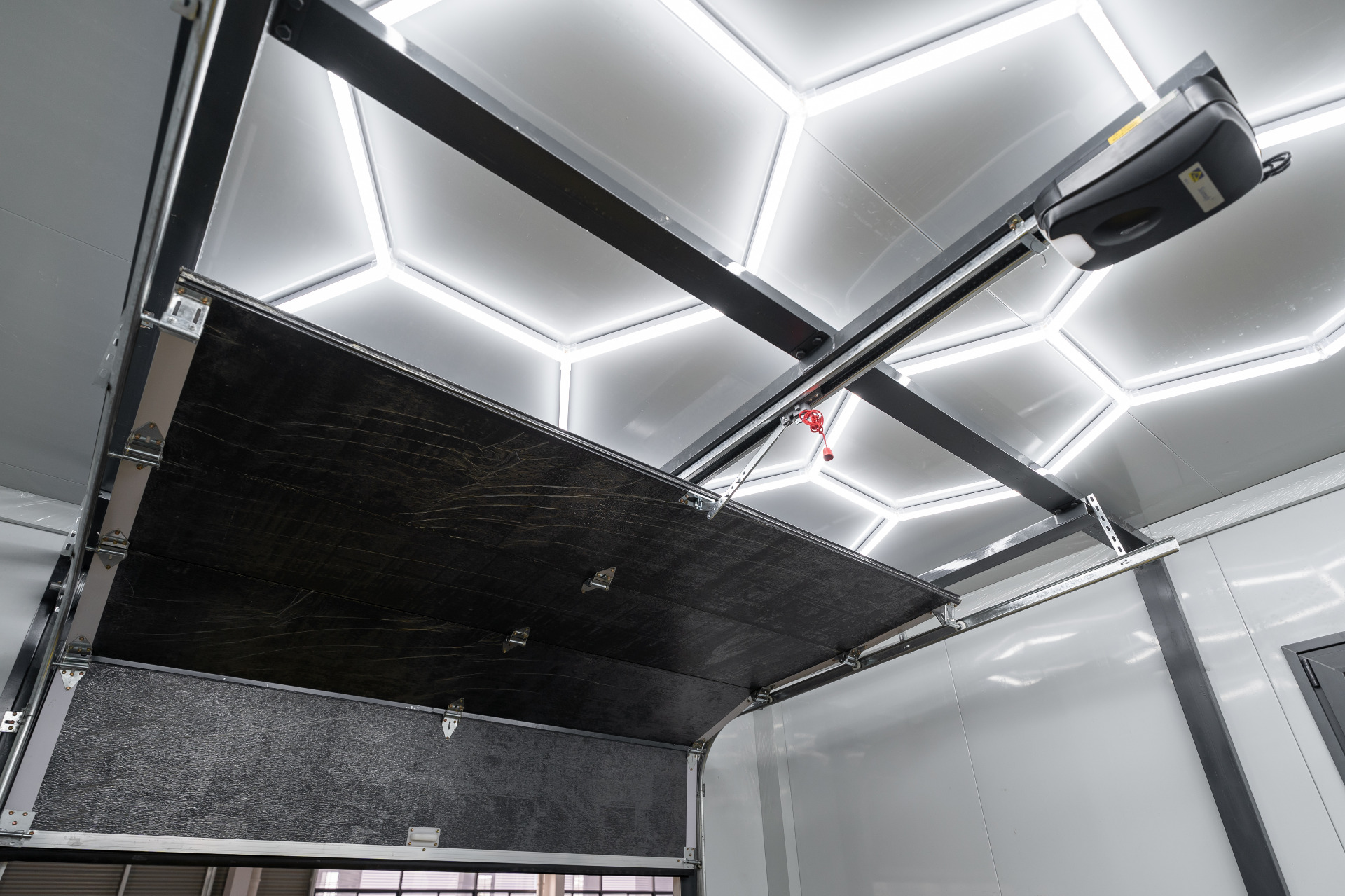 Zateplená konstrukce, atiková střecha, automatická vrata Hörmann.