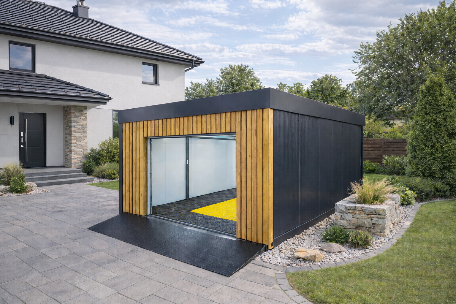 Moderní modulová garáž s integrovanou podlahou.